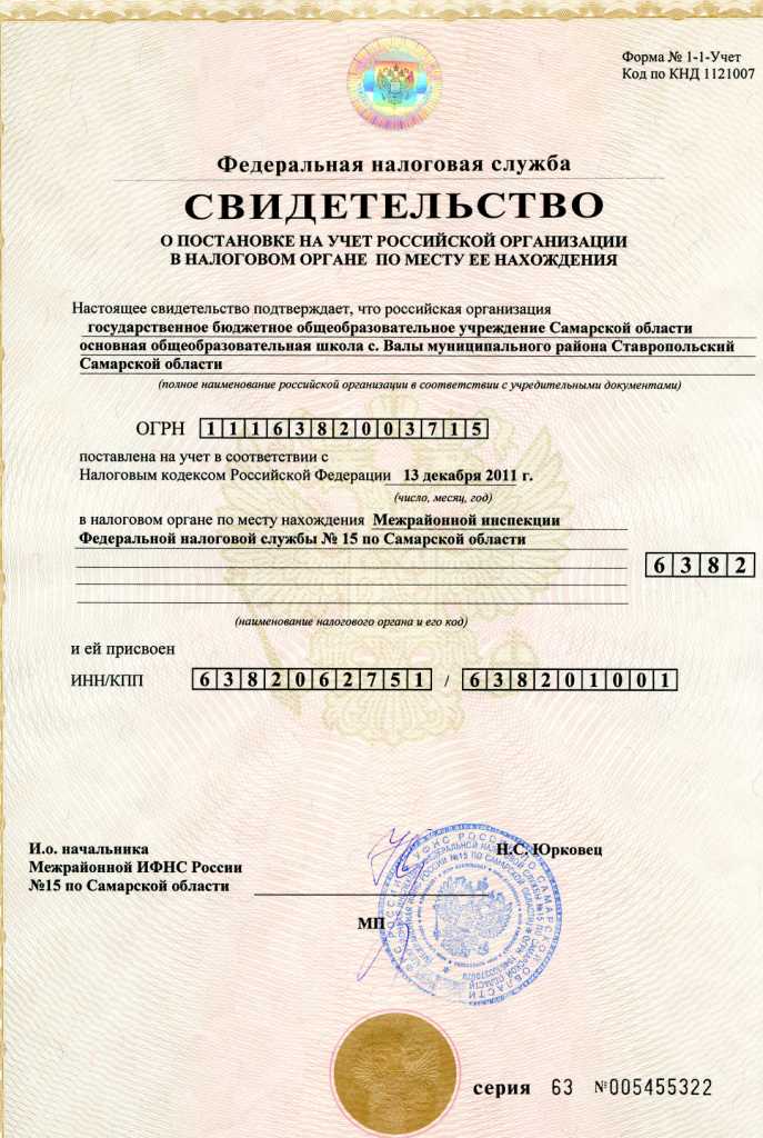 Свидетельство о постановке на учет в налоговом органе ГБОУ ООШ с. Валы